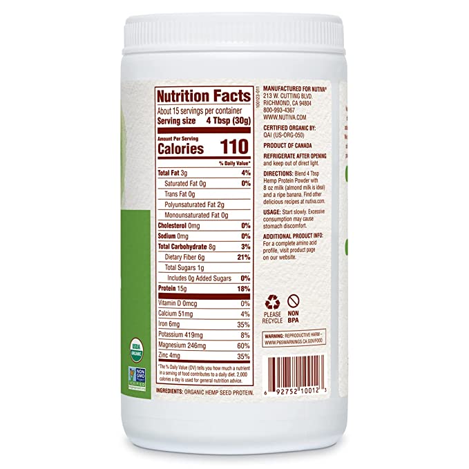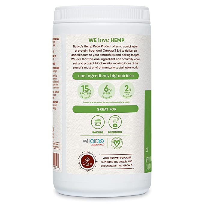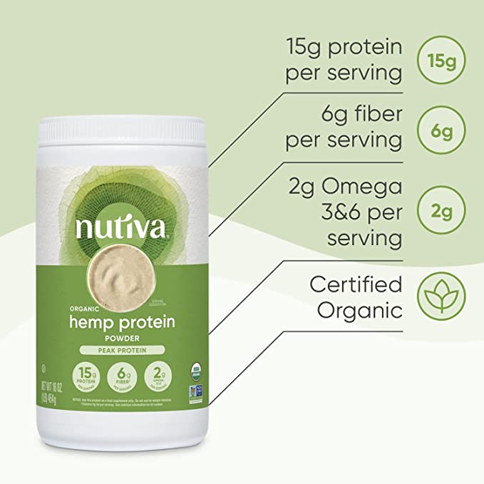 Nutiva Organic Cold-Pressed Raw Hemp Seed Protein Powder, Peak Protein, 16 Ounce, USDA Organic, Non-GMO, Whole 30 Approved, Vegan, Gluten-Free & Keto, Plant Protein with Essential Amino Acids